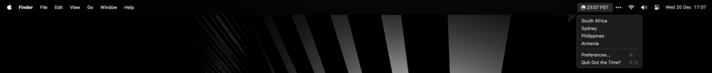 Need to quickly check the time in a different timezone, but don't want to use widgets, or run it through a launcher? Got the Time? is a simple, local macOS menu bar app that allows you to add multiple timezones, and easily switch between them straight from your menu bar. No internet required*